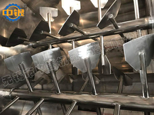 該機臥式筒體內裝有雙軸旋轉反向的漿葉,漿葉成一定角度將物料沿軸向、徑向循環翻攪,使物料迅速混合均勻;為降低設備易損件的更換成本,槳葉葉片可做成兩片式,在葉片基座上墊一塊可移動小葉片,可直接更換磨損的小葉片,經濟快捷; 出料形式一般為氣動(手動)翻板閥,圓弧閥門緊密嵌入筒內,與筒內壁齊平,無物料堆積和混合死角現象;標準型有大開門小開門之分,大開門開口到筒邊,放料干凈快捷,殘留少。