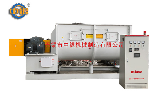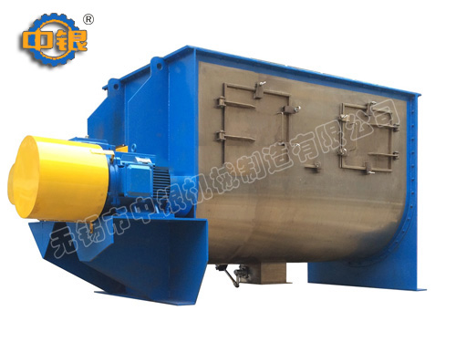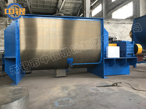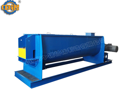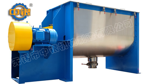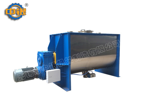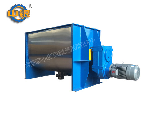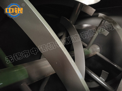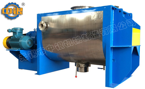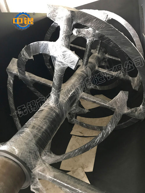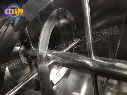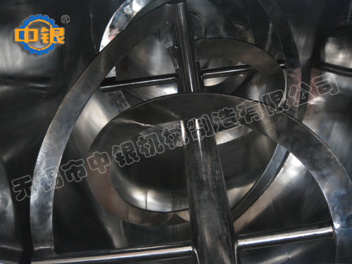 臥式螺帶混合機(jī)以高效、快速混合物料、由攪拌軸的螺旋帶運(yùn)動(dòng)下,使內(nèi)外螺旋帶在較大范圍內(nèi)翻動(dòng)物料,內(nèi)螺旋帶將物料向兩側(cè)運(yùn)動(dòng),外螺旋帶將物料由兩側(cè)向內(nèi)運(yùn)動(dòng),使物料來(lái)回滲混,另部分物料被螺旋帶推動(dòng)下,沒(méi)軸向徑向運(yùn)動(dòng),從而形成對(duì)流循環(huán)。由于上述運(yùn)動(dòng)的攪拌,物料在較短時(shí)間內(nèi)獲得快速均勻混合。